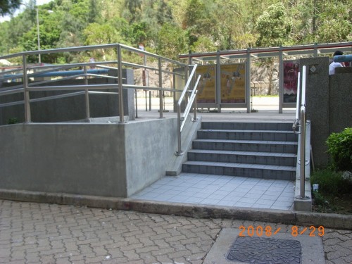 是一段1和5級的梯級,兩旁設有欄杆兼扶手,頂部和底部都沒有觸覺警告帶.