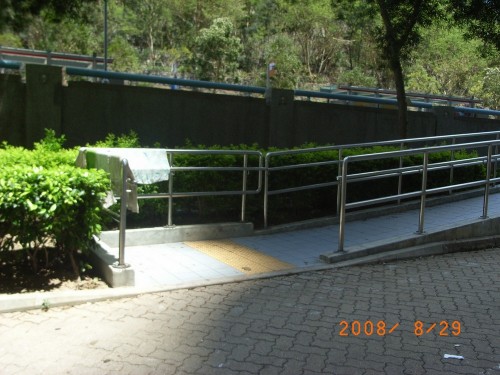 斜道寬闊微斜無障礙,兩旁設有欄杆及扶手,底頂兩端都有觸覺警告帶.