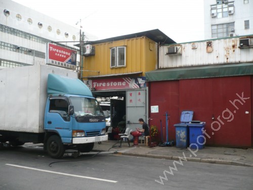 連接汽車路旁行人路,通道是寬闊平坦的廠房出入口閘門,無觸覺引路徑,閘門是灰色金屬面對開閘門.