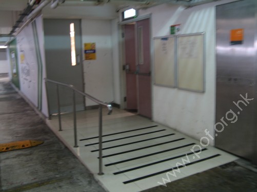 通道是斜度不大的斜道,一邊設有欄杆式扶手,斜道頂正面通往升降機設有一扇木門,側邊往梯級通道設有兩扇木門,無觸覺引路徑.