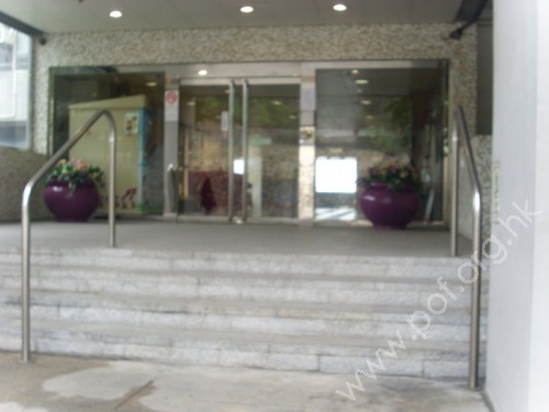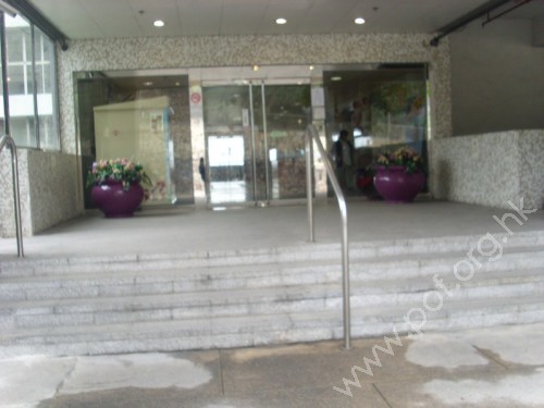 通道寬闊,入口有一段4級踏板的梯級,旁邊停車場有平路可到達大廈入口,設有兩扇不銹鋼框玻璃密碼門,旁邊有密碼按鈕,無觸覺引路帶。