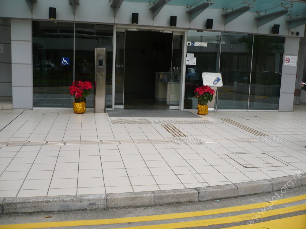 自動門前設有金屬頂黃色觸覺引路帶,向前伸延,分支一端連接設於門旁的觸覺點字及凸字地圖,另一端伸延連接G座前的觸覺引路帶,往醫院各座伸延;自動門進入後設有觸覺引路帶,伸延連接詢問處、升降機及暢通易達洗手間。