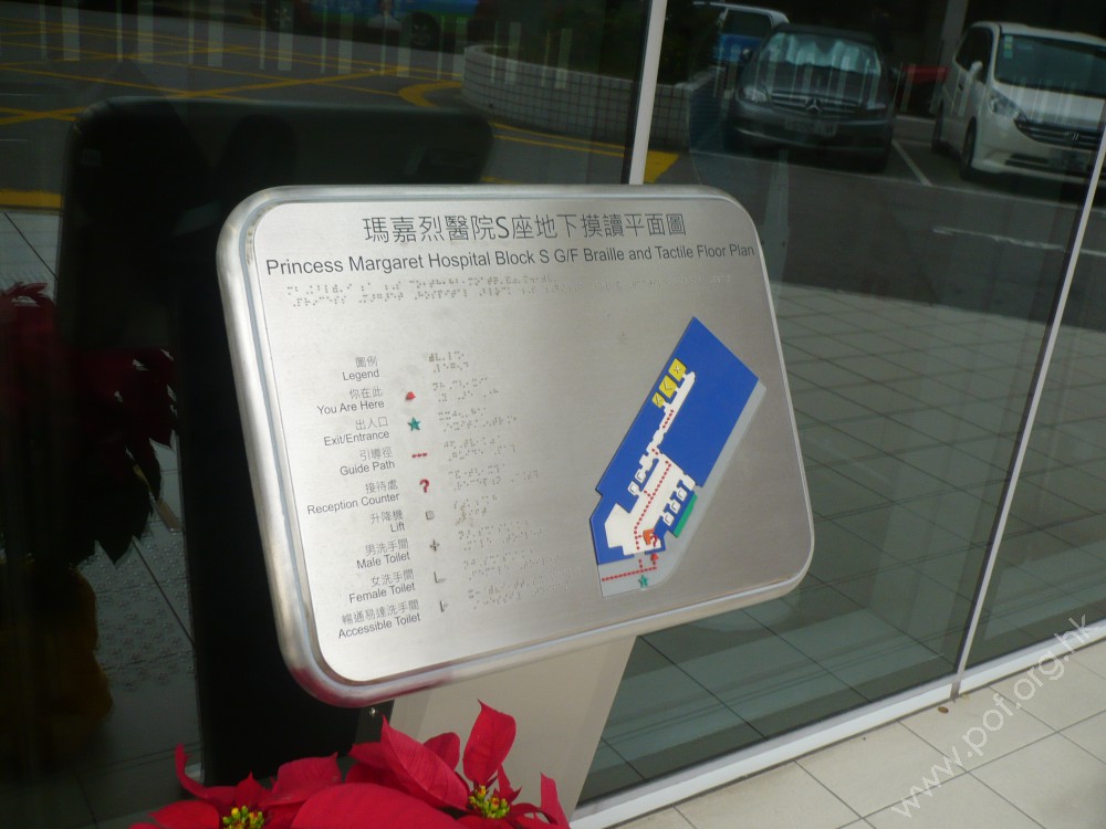經醫管局的無障礙提昇工程設置的,是介紹大樓地下層設施的摸讀平面圖,設有觸覺引路帶導引而至,高度適中;平面圖設有觸覺圖案介紹地下層設施分佈位置,觸覺圖案旁設有中英文及觸覺點字資料。
