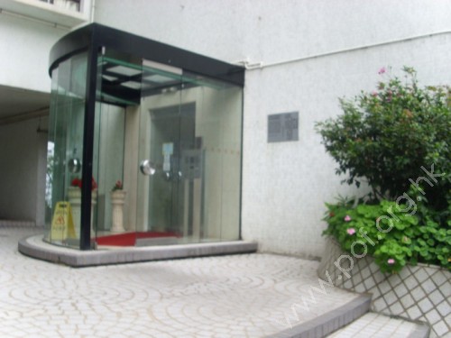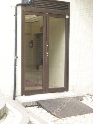 通道闊足1.05米,入口前有兩級梯級,旁邊有斜道,住宅入口有一級梯級,設有兩扇玻璃推門,門內再有兩扇密碼玻璃推門,旁邊有密碼按鈕側柱,無觸覺引路帶。