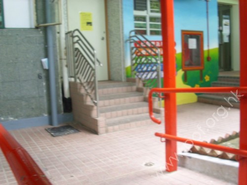 通道闊足1.05米,入口前有1段4級踏板的梯級,左右兩邊有扶手,設有一扇米白色木門,無觸覺引路帶也無觸覺警告帶。