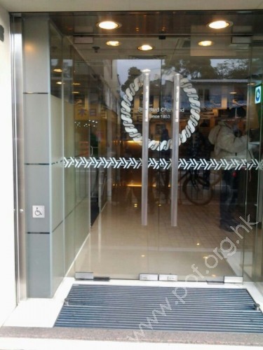 通道寬闊,入口有一級梯級障礙,設有兩扇手推玻璃門,無觸覺引路徑.經本會投訴跟進後,分行入口已安裝召援鐘,有需要人士可按鐘尋求協助.