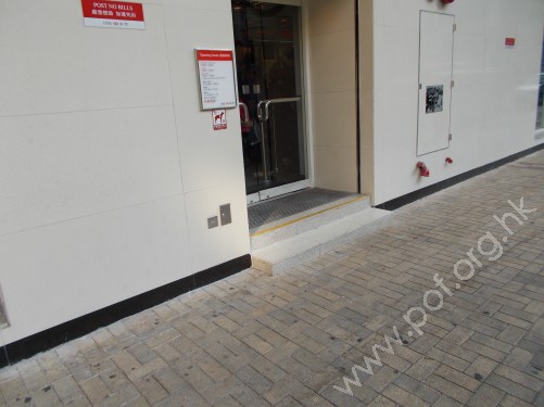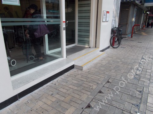 連接汽車路旁行人路與銀行分行正門,踏板闊度及豎板高度適中,共有兩級梯級,頂底兩端無觸覺警告帶,兩邊無扶手及牆壁。