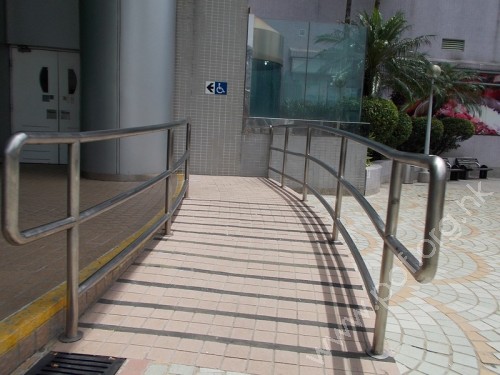 管狀不銹鋼欄杆式設計,固定在斜道兩旁,直徑及高度適中,底頂兩端有平行地面伸延設計,無觸覺點字或凸字資料。