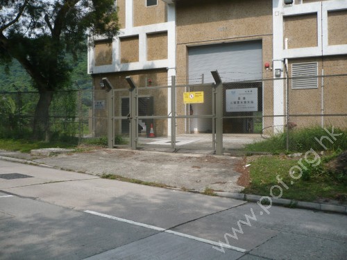 連接汽車路,通道是寬闊無障礙的抽水站汽車出入口閘門,往來抽水站內建築物,旁是草地無行人路及觸覺引路徑,閘門是灰色金屬框架鐵窗對開大閘門.