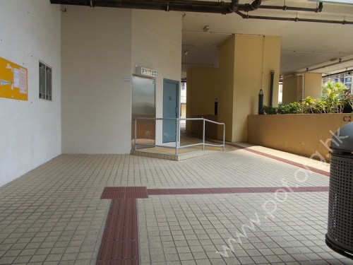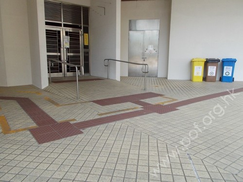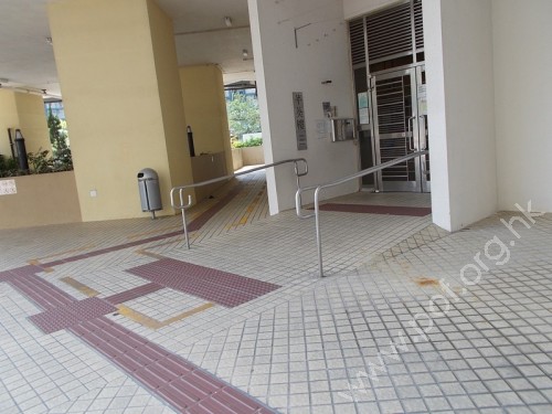 通道闊度不足1.05米但足夠輪椅出入,入口前是斜道設計,設有一扇不銹鋼門,無觸覺引路帶。