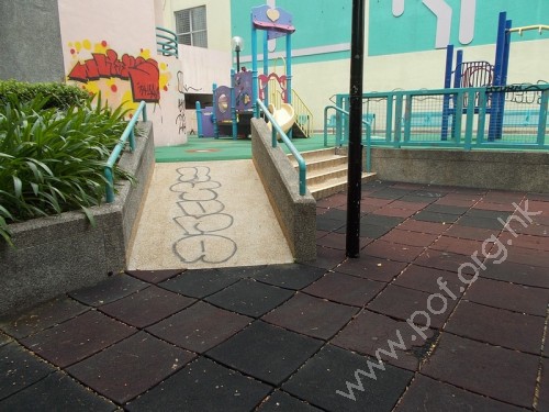 通道寬闊,入口先有兩段梯級,設有兩段梯級連接兒童遊樂場入口,無觸覺引路帶。