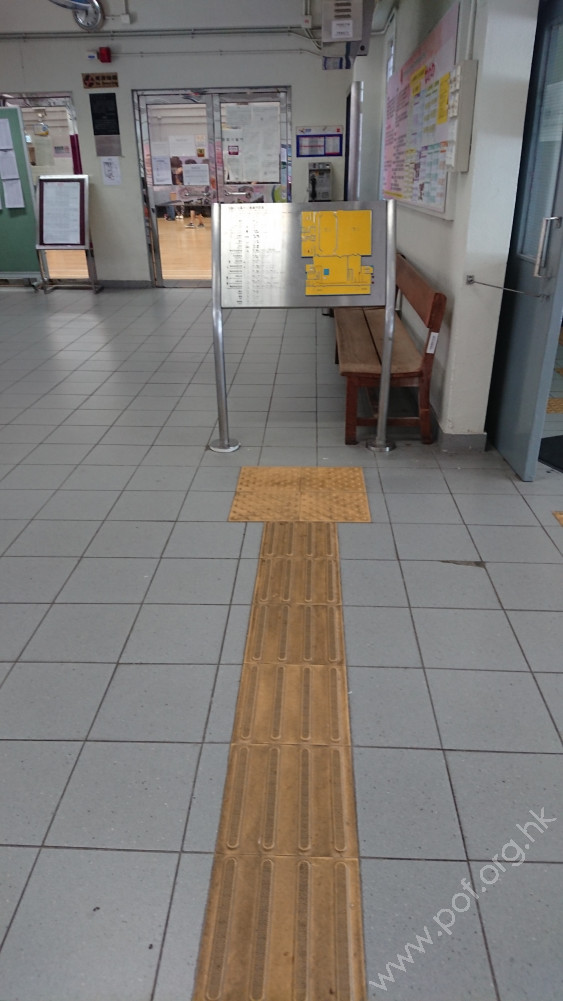 黃色觸覺引路帶,由入口內引導至大堂樓梯通道前、再引導至摸讀平面地圖及服務櫃台前,最後延伸至洗手間前及另一條樓梯通道前。