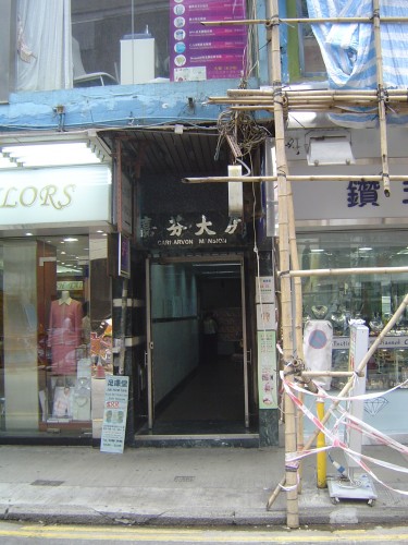 連接汽車路旁行人路,通道寬闊,前臨一級台階障礙,無斜道輔助,無觸覺引路徑,門是不綉鋼框對開閘門。