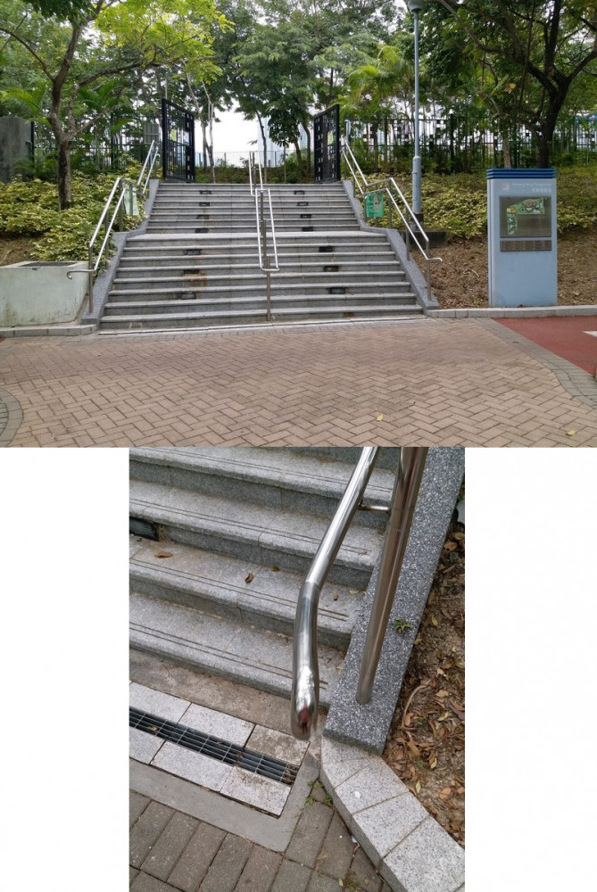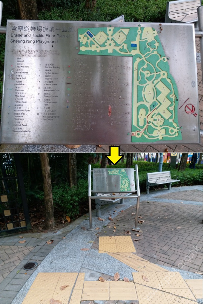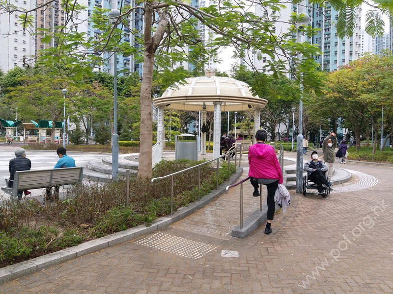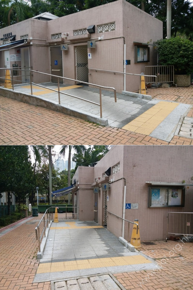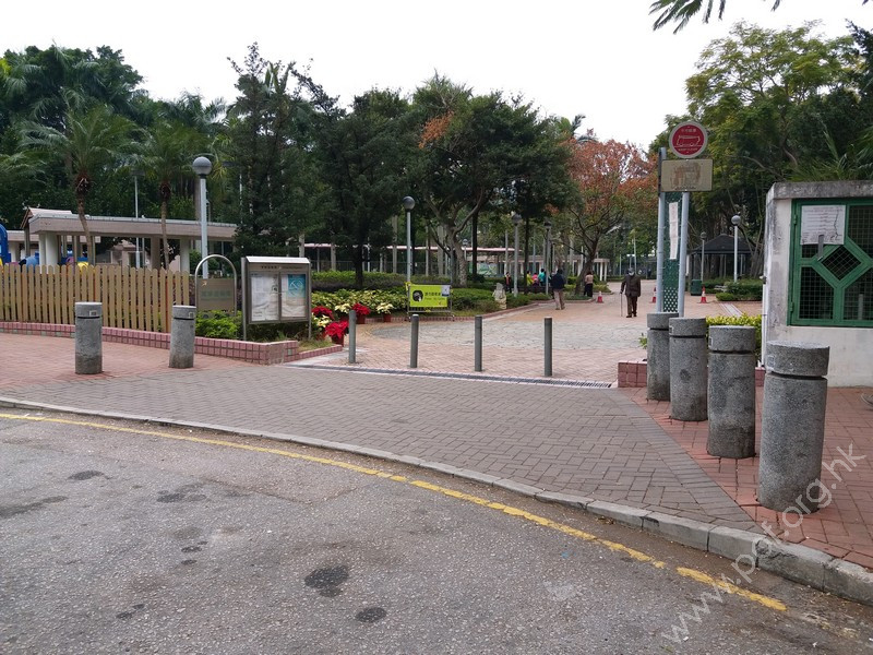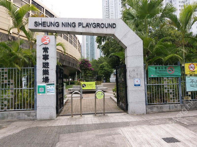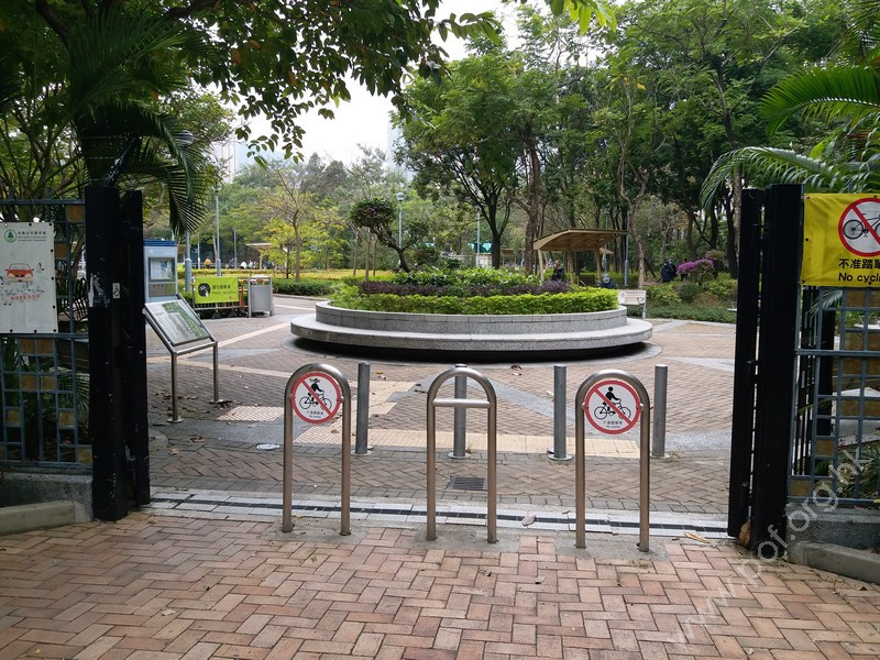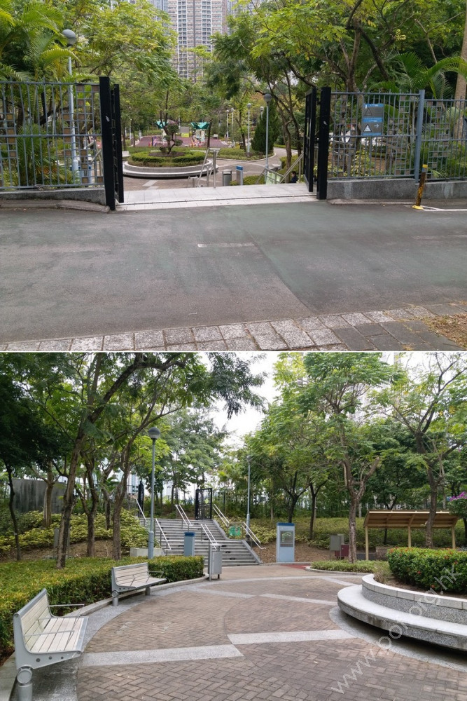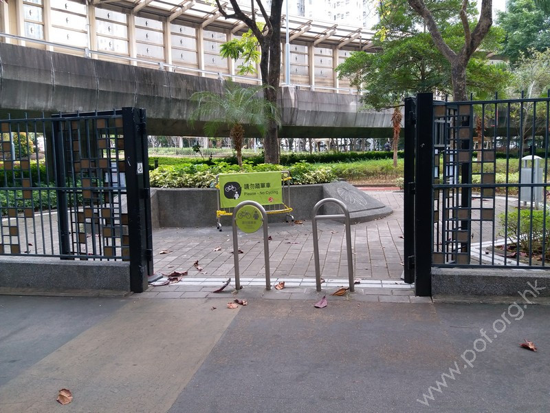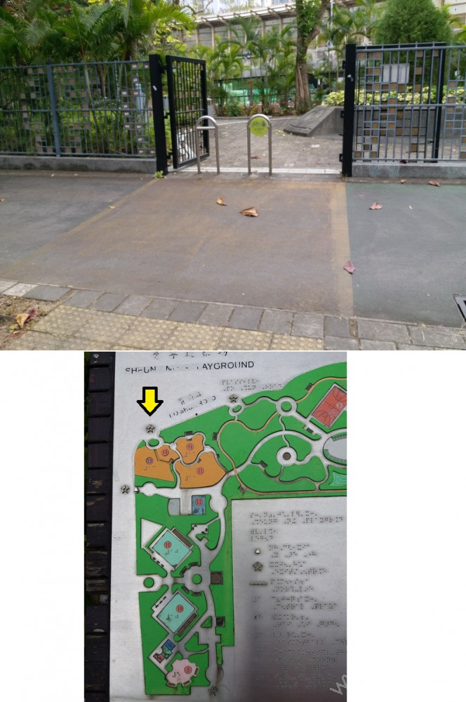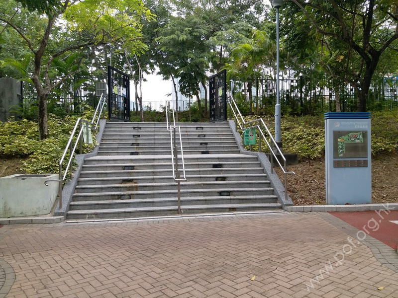 連接安寧花園私人屋苑內通道,通道寬闊、平坦,入口側邊有國際暢通易達標誌,設有一道黑色的對開金屬閘門,在遊樂場開放時常開,前排橫向豎有3條金屬欄杆以防止單車進入,後排再有多條上鎖的金屬圓柱,入口左邊欄杆與閘門間的淨闊度足夠輪椅通過;入內是兒童遊樂場、長者健身園地、太極園,往左遠處有暢通易達洗手間兼淋浴間及男、女廁;黃色觸覺引路帶由入口內伸延至摸讀平面圖前、前往暢通易達洗手間兼淋浴間的斜道底端。