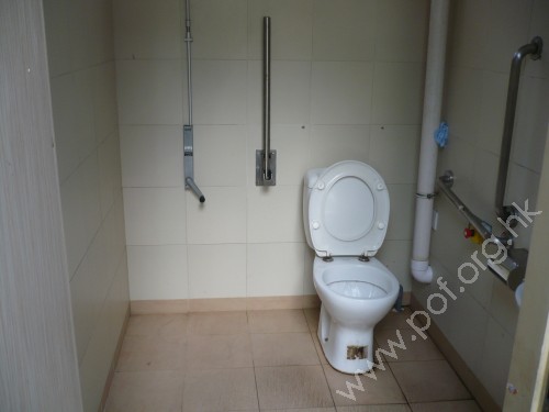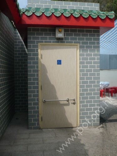 連接仙館墨莊旁行人路,通道是一扇門闊度的障殘人士洗手間出入口,平坦無障礙,無觸覺引路徑,門是棕色單邊推門,門上有扶手,及藍色底色國際蜂通易達標誌,標示是無障礙設施,門鎖原缺了扭把不能上鎖,經本會投訴跟進後門鎖已修好.