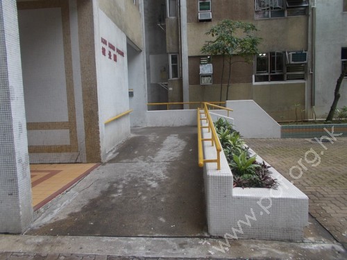 斜道足1.05米闊,斜度大,頂底部有平面,單邊有牆壁,另一邊有扶手安裝於很矮的牆上,底頂無觸覺警告帶。