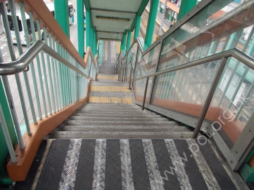 設有三段梯級連接地面及橋面,分別由底段起有:16、12及11級梯級,踏板高闊適中,兩旁有扶手,底頂部平面有觸覺警告帶。