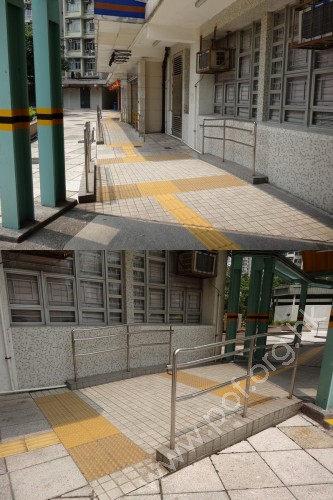 斜道闊3米,斜度低過1:12,一邊設有扶手。底頂無觸覺警告帶,有黃色觸覺引路帶。