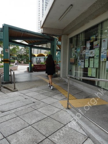 連接屋邨行人路,通道寬闊平坦,是開放式無門廊設計,闊4米,出入口兩旁有花槽及垃圾筒,無觸覺引路帶。