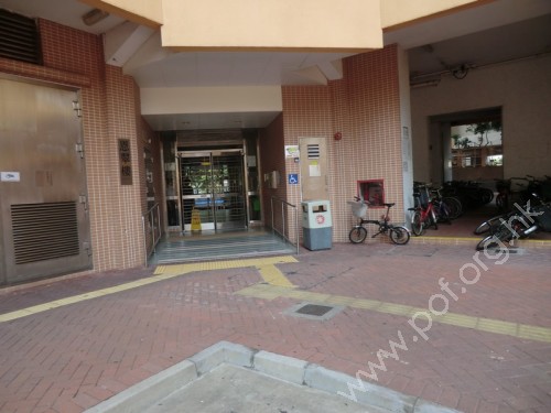 通道闊2.4米,有國際暢通易達標誌,入口對出是微斜的斜面,斜度適中,斜面上有黑色防滑條,設有黃色觸覺警告帶,有扶手。入口有金屬對開閘門,單邊閘門的淨空間闊度足0.8米,門旁有密碼鎖。有黃色觸覺引路帶由其他屋邨大廈伸延至閘口前。
