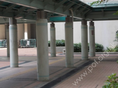 連接屋邨有蓋行人路,通道是斜道,闊1.8米,斜度1:12,無扶手,斜道頂部是大廈入口設有兩扇不銹鋼框玻璃推門,單扇玻璃門推開的淨空間闊0.8米,門旁設有密碼鎖及3個回收箱;斜道頂部是灰色的觸覺警告帶,底部是黃色的觸覺警告帶連接同色觸覺引路帶往屋邨其他公共設施及大廈。