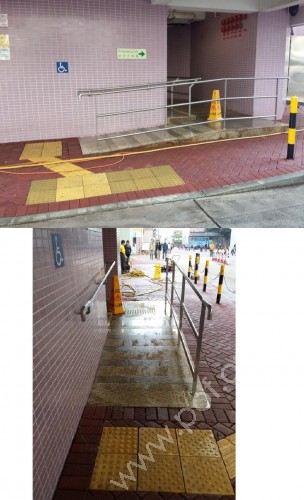 有國際暢通易達標誌,通道由斜道及一級踏板組成,通道闊1.2米,一邊是不銹鋼欄杆,一邊是牆壁;有扶手,大樓入口設有對開玻璃門,單邊玻璃門的淨空間闊度不足0.8米,門前後均有觸覺警告帶。設有黃色觸覺引路帶由下斜路緣伸延至斜道底部。