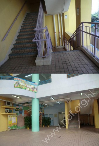 由地面層至天台層,共有6段,每段階梯不超過16級梯級。梯級闊1.4米,踏板闊270毫米,豎板高150毫米;兩旁有管狀金屬扶手固定於欄杆上,無觸覺警告帶。