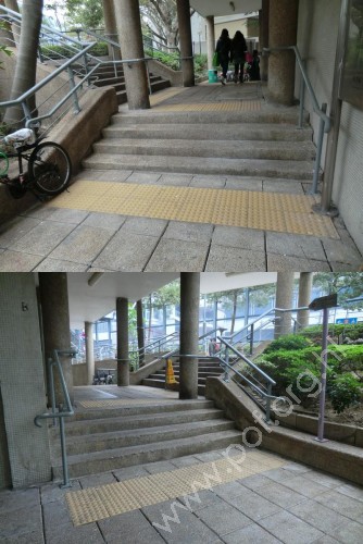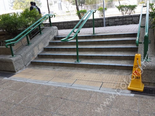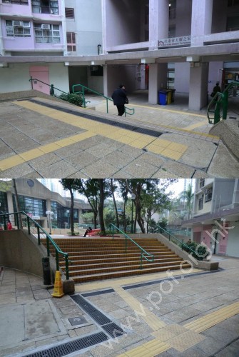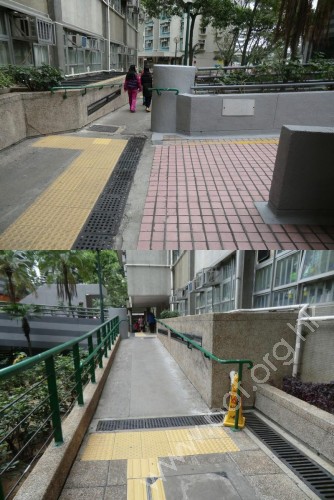 黃色觸覺警告帶連著同色觸覺引路帶,底部由屋邨出入口及其他公共設施伸延至梯級前,頂部則由下斜路緣伸延至梯級。