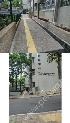 斜道底部設有黃色觸覺引路帶伸延至耀豐樓、其他的大廈出入口。