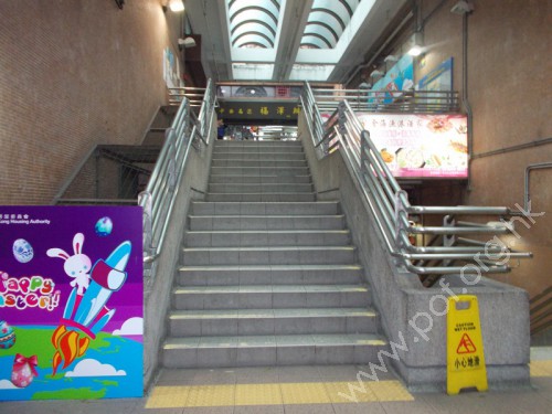 由G樓通往1樓,共有兩段梯級,每段有8級踏板,段與段之間有一個平台。樓梯闊1.8米,踏板闊250毫米,豎板高150毫米,兩旁是不銹鋼扶手,底頂及平台設有黃色觸覺警告帶。