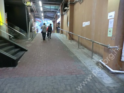 斜道由地面通往商場樓梯,斜道闊6米,斜度1:6,中間及兩邊有不銹鋼扶手,僅頂部有觸覺警告帶,牆壁與地板無明顯分野。