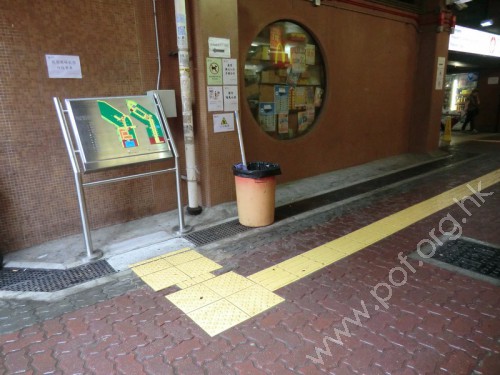 多能感應地圖,離地高1.5米,設有觸覺點字及凸字資料,有彩色凸出標誌,旁有點字說明。有廣東話及英文語音發聲指示。有聲訊提示,地圖前鋪有黃色觸覺警告帶及黃色觸覺引路帶。