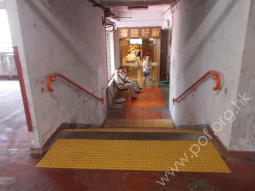 底部連接喜讌好廚酒樓後門,頂部是連接2樓停車場,有9級踏板,闊1米,豎板高130毫米,兩邊有外塗橙色的金屬扶手,沒有觸覺警告帶。