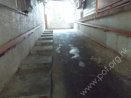 通道由斜道及踏板組成,底部連接喜讌好廚酒樓後門,頂部是連接2樓停車場,通道寬闊,無觸覺引路帶。