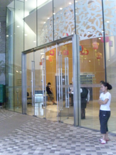 可由此通道進入,乘自動電梯往住宅穿梭升降機大堂,通道入口寬闊平坦無障礙,設有手推玻璃門,無觸覺引路帶.