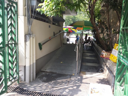 斜道闊1.2米,斜度1:10,兩邊是金屬欄杆,及兩邊均設有扶手,無觸覺警告帶。