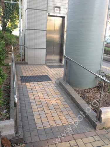 斜道前往升降機,斜道闊1.05米,斜度低於1:12,兩旁有不銹鋼欄杆兼扶手,斜道頂部連接升降機,頂部連接行人路,頂底部有黑色觸覺警告帶。