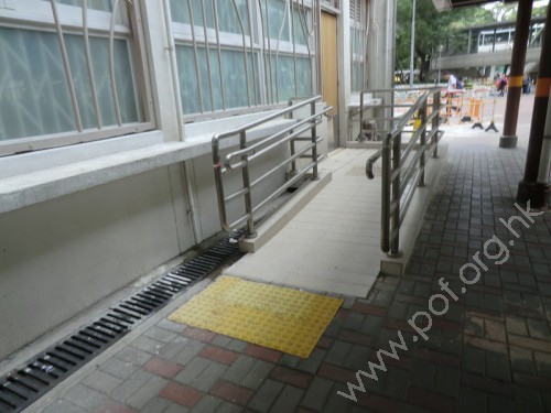斜道闊0.9米,斜度適中,兩邊有不銹鋼欄杆及扶手,頂底部有足夠的平面空間,有觸覺警告帶。
