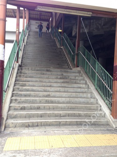 通道是寬闊梯級,共有4段,段之間有平台,兩旁有欄杆和管狀金屬扶手固定於天橋支架上,無觸覺引路帶。