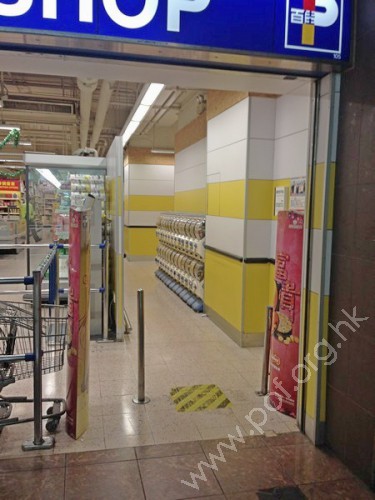 通道寬闊平坦,入口是開放式無門設計,兩邊設有防盜裝置,中間有兩條不銹鋼矮柱,柱之間淨空間闊度足0.8米,無觸覺引路帶。