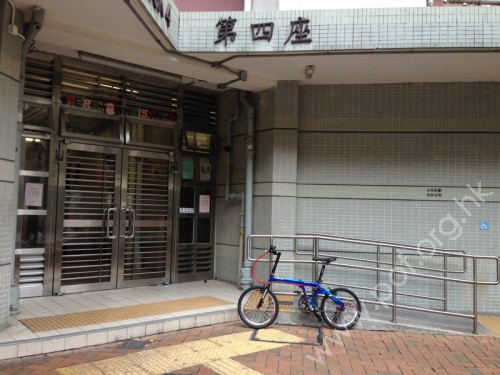 入口前有簡易斜面,設有防滑條,兩邊有水管於牆身凸出;入口是對開金屬框邊玻璃門設計並設有密碼開啟,門淨空間闊度足0.8米,無觸覺引路帶。