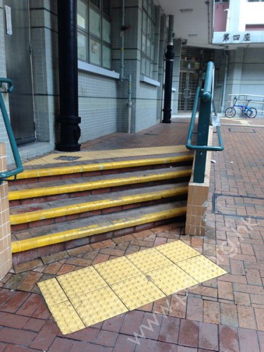 斜道闊1.2米,斜度1:12,兩邊有管狀不銹鋼欄杆,頂底部設有黃色觸覺警告帶。