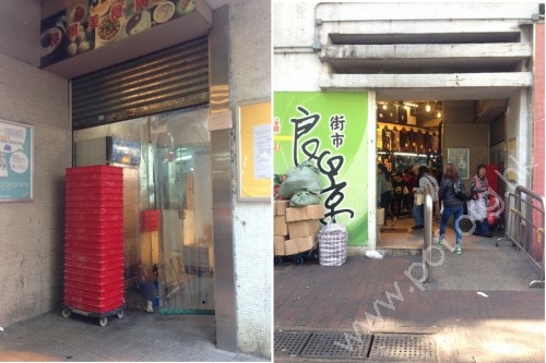 通道寬闊,街市入口是開放式無門設計,由一級踏板及簡易斜面組成,斜面兩邊有高於1米的不銹鋼欄杆;街市入口右邊有另一出入口通往美食廣場,設有透明膠簾幕,一邊放有雜物,無觸覺引路帶。