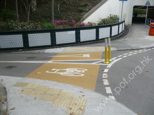連接行人路與單車徑,位於行人隧道行人斜道前行人過路處兩邊各有一個,是橫過單車徑的行人過路設施;面積寬闊,斜度低矮;兩邊斜面均設有黃色觸覺警告帶;頂端連接行人路,有行人路保留空間;路緣石壆低及單車徑;視野開揚。此下斜路緣是經本會投訴跟進後,運輸署在行人斜道頂設置附有下斜路緣的行人過路處。