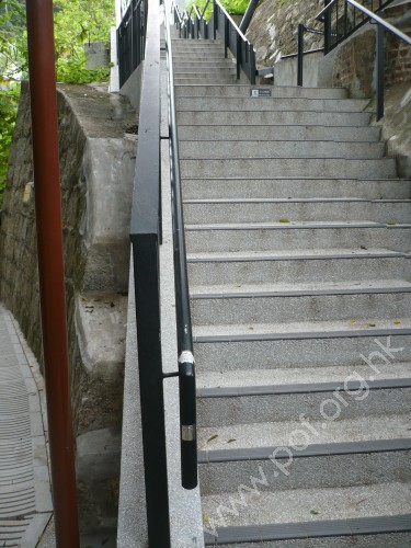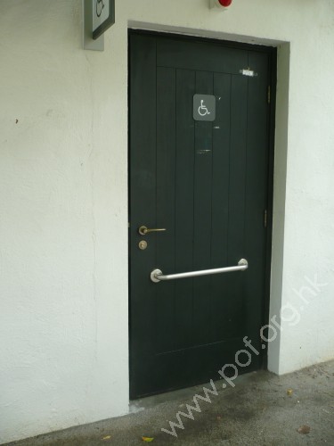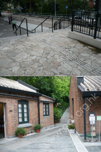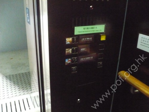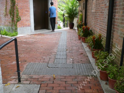 連接G層F座旁中區的平台行人路,通道是寬闊平坦無障礙的文化館2號升降機樓通道,往來1樓F座上層出入口,與2樓往來上區的行人路;升降機門闊0.85米,門前設有灰色觸覺警告帶;無觸覺引路帶;門柱上有藍色暢通易達標誌,標示是無障礙通道。