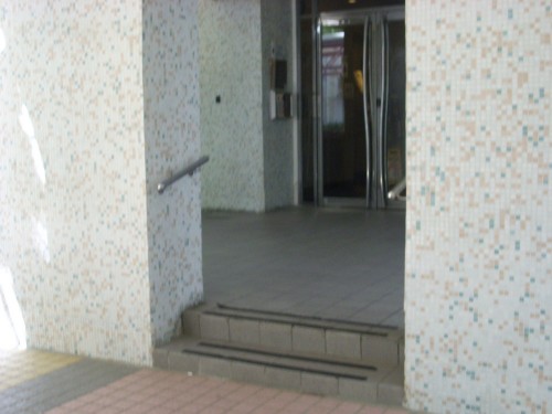 通道入口設有兩級梯級,另一邊有斜道輔助,前臨手推玻璃門,無觸覺警告帶.
