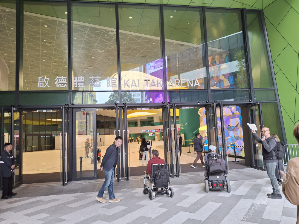 通道寬闊平坦,設有兩扇對開的手推玻璃門,門外是筆直的長走廊,走廊高過停車場一級梯級,鋪有不鏽鋼質地的觸覺警告帶,在近場館出入口處設有下斜路緣。無觸覺引路帶。