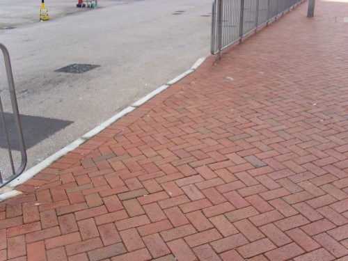 面積寬大,方便輪椅人士及車輛出入,但沒有觸覺警告帶.路邊石壆高度不超過10毫米.左右兩邊有鐵欄.