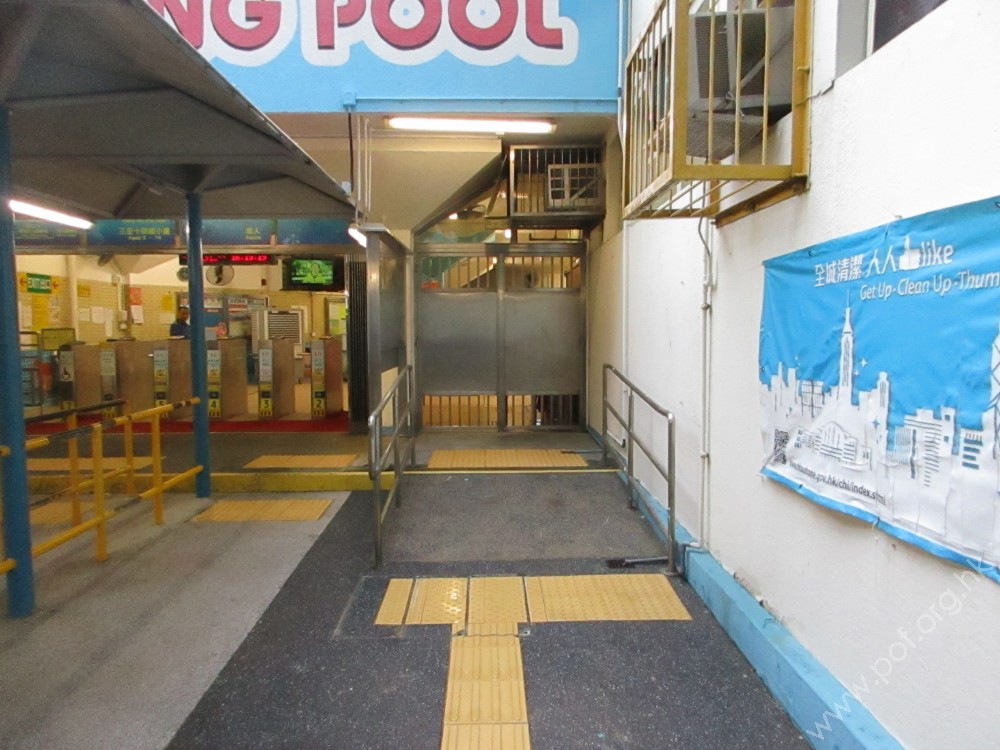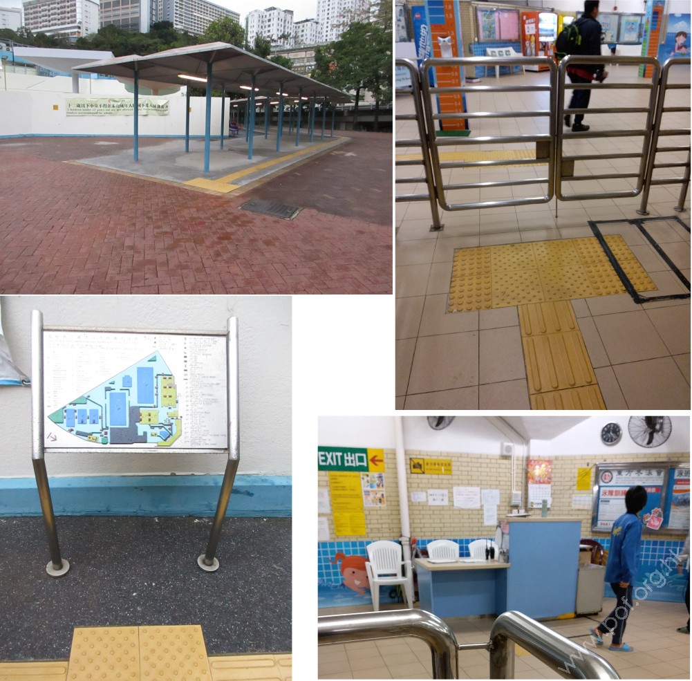 有一條觸覺引路帶,由有蓋走廊的一端引至觸覺點字及凸字地圖前,經輪椅人士專用出入口後引至詢問柜位前。