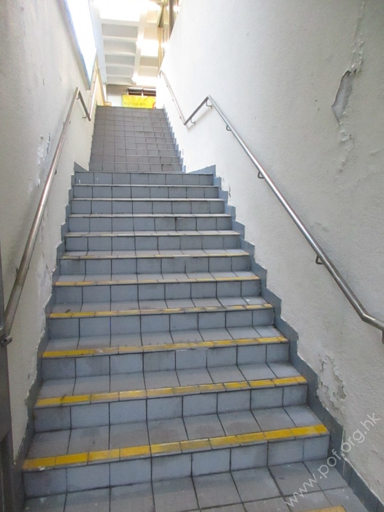梯級共有兩段,踏板闊度與豎板高度適中,兩邊裝有扶手,頂部、底部和平台設有觸覺警告帶。
